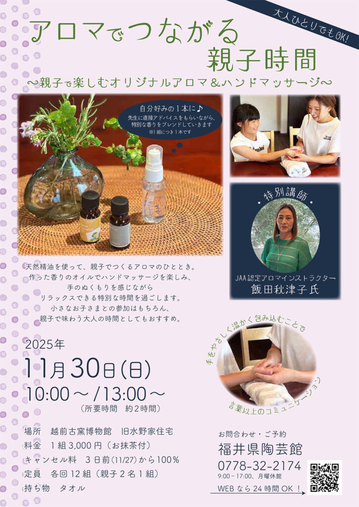 【福井県陶芸館】アロマでつながる親子時間〜親子で楽しむオリジナルアロマ&ハンドマッサージ〜
